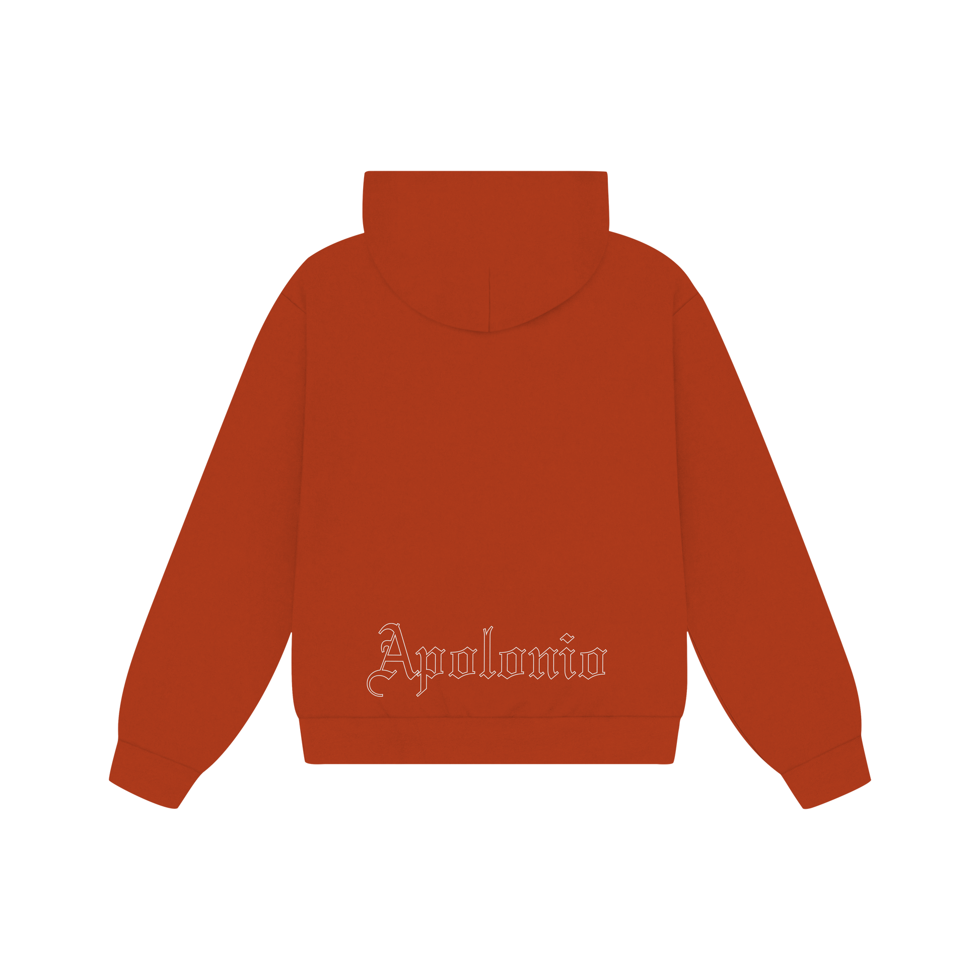 Burnt orange 5-year anniversary hoodie in our classic silhouette. All graphics are screen-printed.